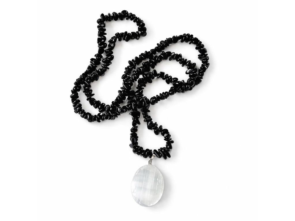 Materiál: Sečkaný čierny onyx (čipy), prívesok z lešteného selenitu.