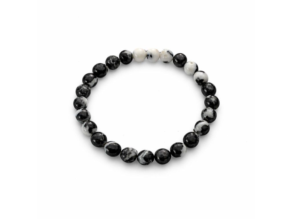 Náramok je tvorený leštenými guličkami prírodného zebramramoru, pričom každý jeden kameň nesie svoju neopakovateľnú kresbu čiernych a bielych línií. Celkové prevedenie pôsobí moderne a minimalisticky, čo z neho robí univerzálny doplnok vhodný pre dámy aj pánov.