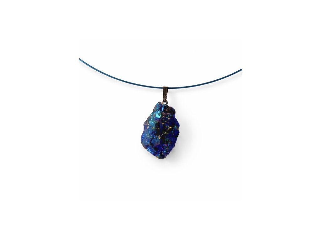 Prírodný chalkopyrit je v tomto prevedení ponechaný vo svojom surovom, organickom tvare, čo podčiarkuje jeho autenticitu. Je zavesený na modrej obruči (lanku), ktorá farebne korešponduje s jeho najvýraznejšími odleskami a dodáva celému šperku moderný, až futuristický vzhľad.