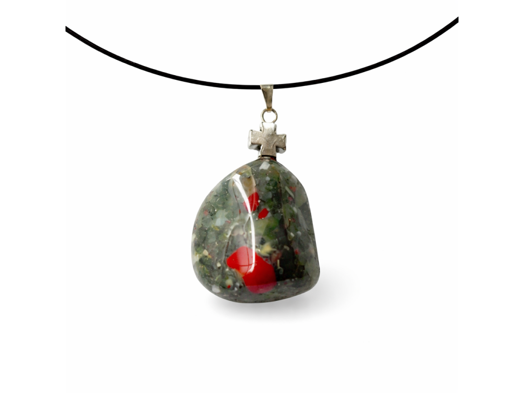 Heliotrop bol už v staroveku uctievaný ako kameň, ktorý dokáže ovplyvňovať živly a chrániť pred nebezpečenstvom. Červené inklúzie v zelenej mase kameňa mu dodávajú dramatický a nezameniteľný vzhľad. Symbol kríža, ktorý dopĺňa tento minerál, znsobuje jeho ochranný účinok a robí z neho ideálny osobný sprievodca pre každého, kto čelí životným skúškam.