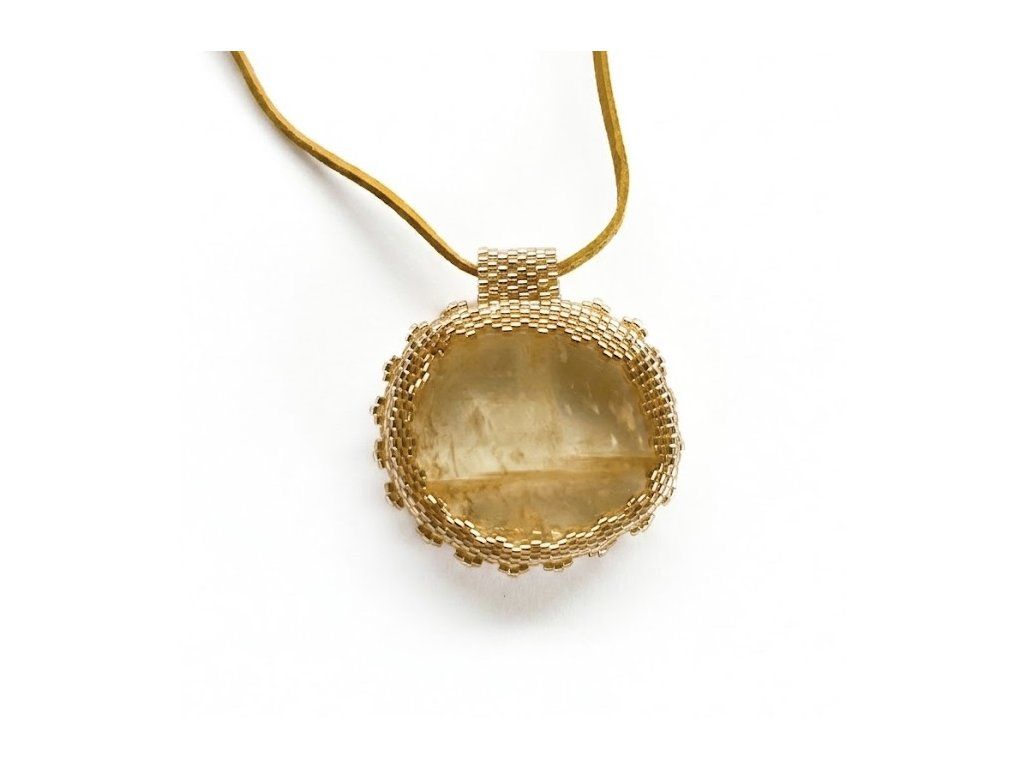 Kameň je precízne ručne obšívaný kvalitnými korálkami v zlatých odtieňoch, ktoré umocňujú jeho solárnu energiu. Každý kus prešiel procesom tvorby s dôrazom na zachovanie prirodzených vibrácií kameňa, aby sa k vám dostal ako čistý nástroj pre vašu osobnú transformáciu.