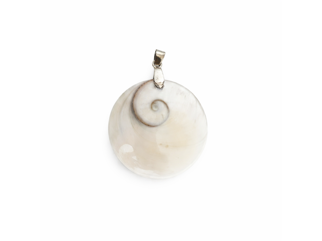Prívesok má krásny, kruhový tvar s prirodzeným perleťovým leskom na zadnej strane. Predná strana odhaľuje detailnú špirálu, ktorá je centrálnym bodom celého šperku. Vďaka striebornému úchytu pôsobí šperk veľmi moderne a elegantne, pričom si zachováva svoju prírodnú dušu.