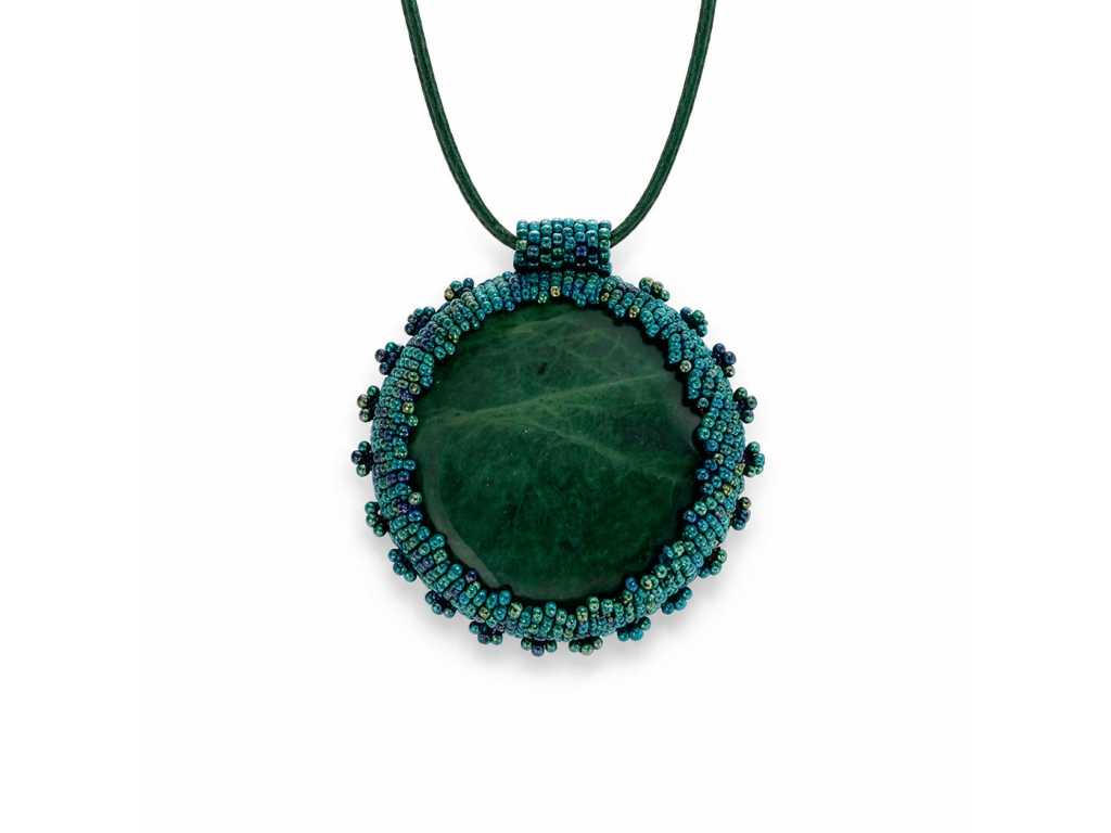 Prírodný nefrit je osadený do bohato obšívaného rámu z kvalitných korálok v tmavozelených a metalických odtieňoch. Tento detailný lem nielen chráni samotný minerál, ale dodáva mu kráľovský a mystický vzhľad. Každý steh je výsledkom trpezlivej ručnej práce, vďaka čomu je každý kus unikátnym energetickým žiaričom.